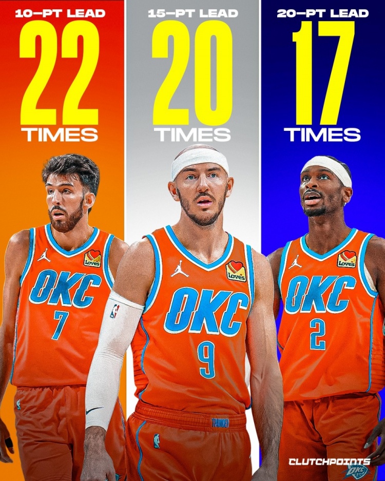 恐怖统治力!雷霆25场比赛中已17次领先对手20+&20次领先15+