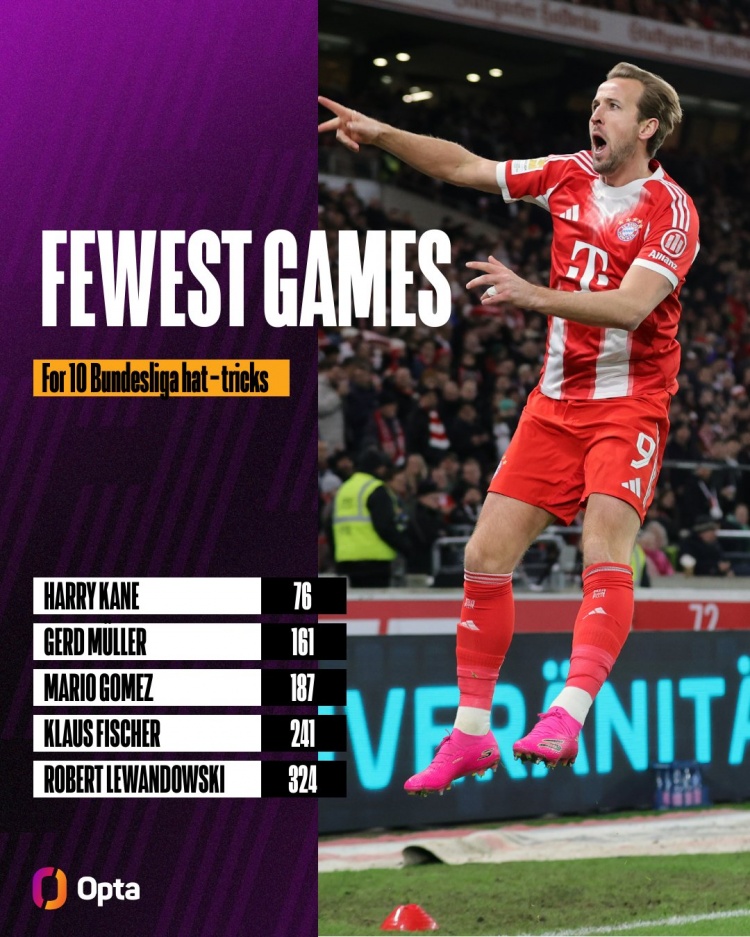 12月8日讯 德甲第13轮比赛,凯恩上演帽子戏法,拜仁客场5-0击败斯图加特。据Opta统计,凯恩出战76场德甲比赛,10次上演帽子戏法,他是德甲历史10次戴帽所用场次最少的球员,只有4名球员德甲戴帽次数更多,他们是盖德·穆勒、莱万、马里奥·戈麦斯和克劳斯·费舍尔。德甲最快达成10次戴帽球员:凯恩——76场盖德·穆勒——161场戈麦斯——187场克劳斯·费舍尔——241场莱万——324场