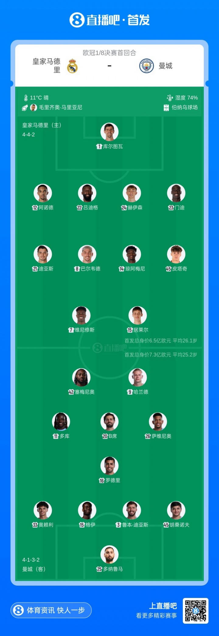 03月12日讯 皇马官方公布了对阵曼城的首发,皇马tv给出的阵型是442,维尼修斯、居莱尔搭档锋线。皇马首发:前锋:7-维尼修斯、15-居莱尔中场:45-蒂亚戈·皮塔奇、8-巴尔韦德、14-琼阿梅尼、21-迪亚斯后卫:23-费兰·门迪、22-吕迪格、24-赫伊森、12-阿诺德门将:1-库尔图瓦
