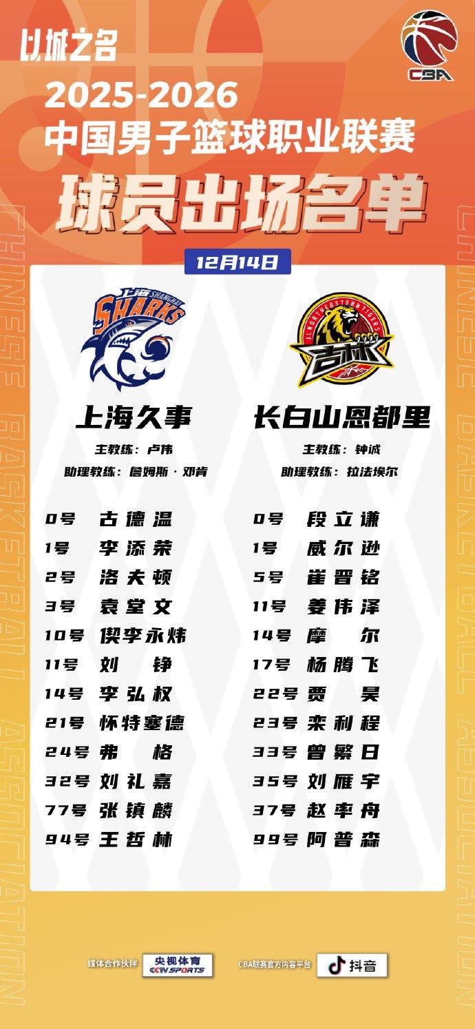 12月14日讯 今晚19:35,上海男篮主场迎战吉林男篮。赛前双方公布了本场大名单。上海:古德温、李添荣、洛夫顿、袁堂文、偰孪永炜、刘铮、李弘权、怀特塞德、弗格、刘礼嘉、张镇麟、王哲林;吉林:段立谦、威尔逊、崔晋铭、姜伟泽、摩尔、杨腾飞、贾昊、栾利程、曾繁日、刘雁宇、赵率舟、阿普森。