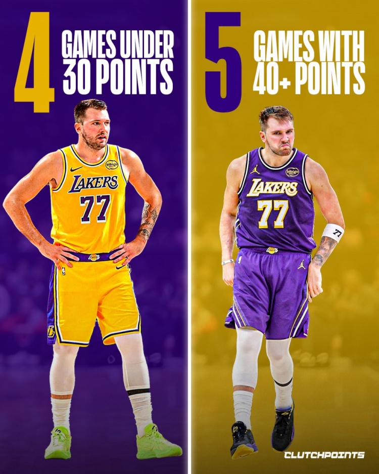 美媒Clutch Points晒图写道:卢卡·东契奇正打出了MVP级别的表现。本赛季至今,他砍下40+得分的场次比低于30分的场次还要多。请仔细体会一下这个数据。五场比赛得分40+。仅有四场比赛低于30分。本赛季卢卡每场得分如下: