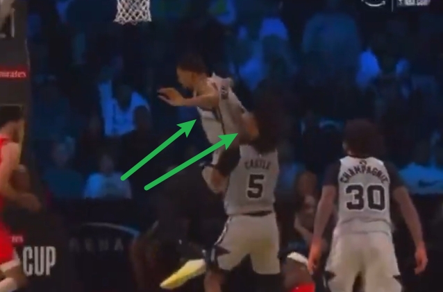 12月15日讯 昨日对雷霆的比赛中,卡斯尔嘴部和鼻子出血+鼻子还塞进了棉花,引发球迷好奇他是怎么受伤的。球迷通过录像里的回放发现,凶手竟是队友文班……文班在一次尝试封盖切特的回合里,挥手不小心打到了卡斯尔的面部,造成了这次受伤。GIF-文班落地时手肘误伤卡斯尔