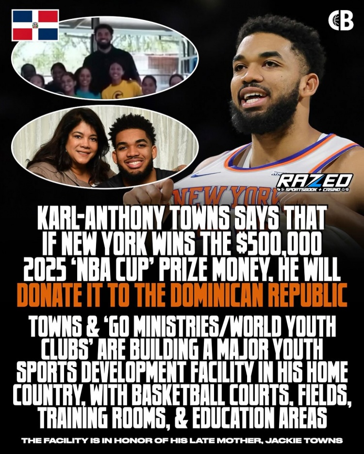12月15日讯 唐斯接受采访时表示,如果纽约尼克斯赢得NBA杯,他的50万美元奖金会全部捐给自己的家乡多米尼加。唐斯目前与“Go Ministries/World Youth Clubs”正在多米尼加的圣地亚哥建设一座大型体育设施,内设篮球场、训练场、运动场以及教育区域。该设施将以他已故的母亲Jackie Towns的名字命名。