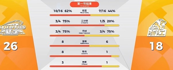 12月15日讯 CBA常规赛,辽宁首节26-18领先广厦。第一节,辽宁高效输出,全队16投10中,命中率62.5%,三分4投3中,命中率高达75%。辽宁球员付豪首节3中3拿到7分,王岚嵚2中2贡献6分。