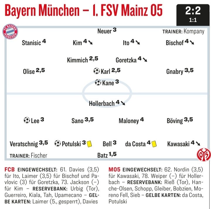 12月15日讯 德甲第14轮比赛,拜仁主场2-2战平美因茨,德国媒体《踢球者》对两队球员进行了评分,奥利塞、基米希、卡尔2.5分拜仁队内最高。