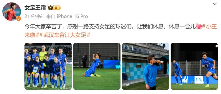 12月15日讯 在武汉车谷江大女足1-2遭非洲冠军拉巴特皇家女足逆转,无缘国际足联女足冠军杯后,王霜更新社媒,感谢了球迷的支持。本场比赛王霜曾在第29分组爆射破门,帮助武汉谷江大女足1-0领先,但最终经过加时赛1-2负于对手。赛后,王霜在社媒晒照写道:今年大家辛苦了,感谢一路支持女足的球迷们。让我们休息,休息一会儿。