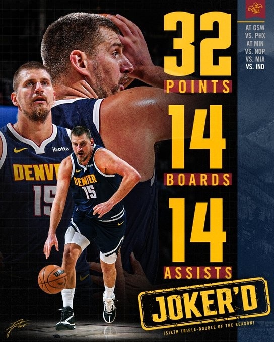 11月9日讯 NBA常规赛,掘金117-100战胜步行者。本场比赛,掘金球星约基奇在32分钟的时间里,投篮14中10,三分球1中1,罚球12中11,砍下32分14篮板14助攻1抢断。赛后,掘金官方发布约基奇数据海报,并写道:“这些都是他在32分钟里做到的