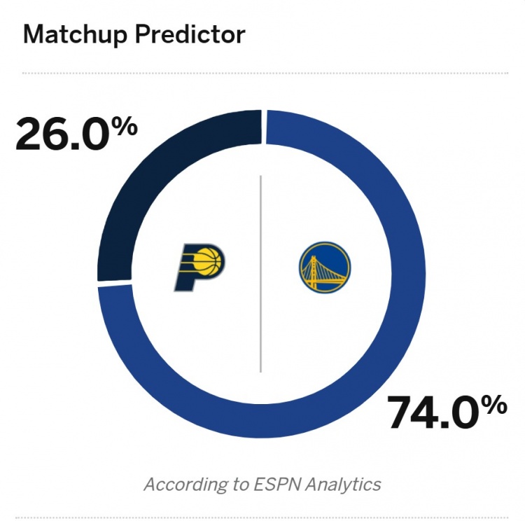 11月9日讯 明天上午9点30,勇士在主场对阵步行者。ESPN对本场胜率进行了预测,勇士胜率高达74%,步行者则是26%。值得一提的是,本赛季双方首次交手中,勇士在客场109-114不敌步行者。值得一提的是,本场勇士队的库里和霍福德目前均为出战成疑。