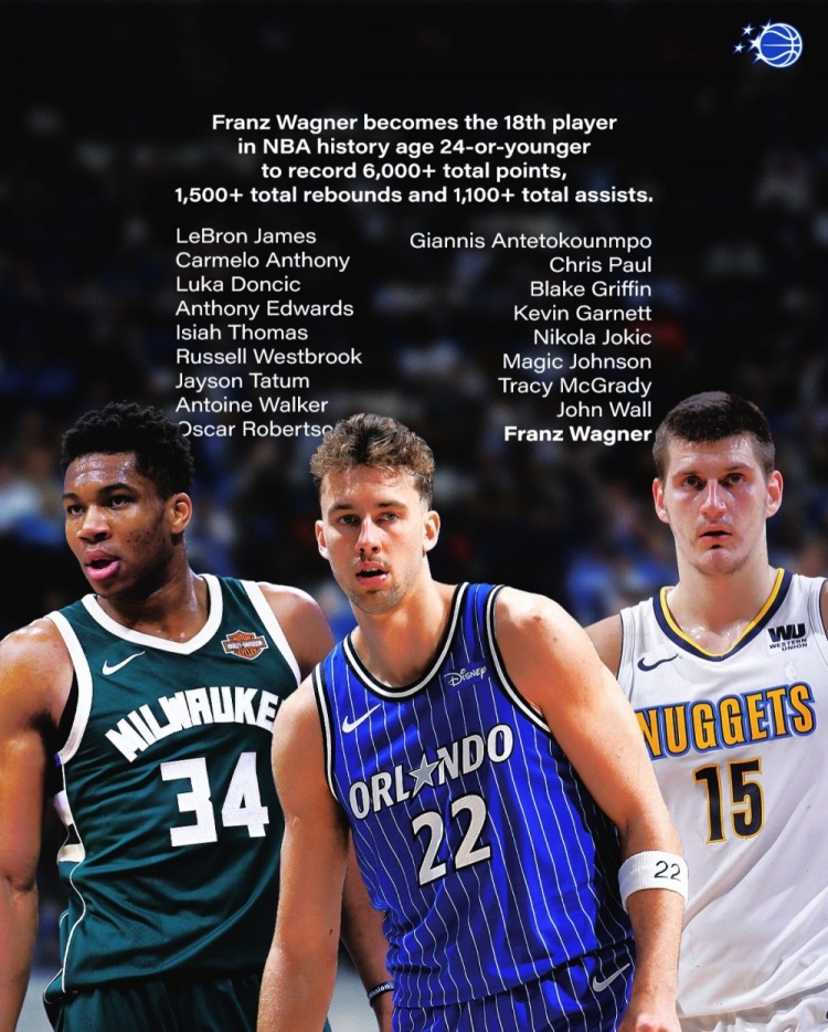 12月1日讯 魔术官方报道,小瓦格纳生涯至今不到五个赛季拿到了6008分1536板1143助攻。他也成为了NBA历史上第18位,在24岁或更年轻达成6000分1500板1100助这一成就的球员。另外17位球员是詹姆斯、安东尼、东契奇、爱德华兹、“微笑刺客”以赛亚·托马斯、威少、塔图姆、安托万·沃克、奥斯卡·罗伯特森、字母哥、保罗、格里芬、加内特、约基奇、魔术师、麦迪、沃尔