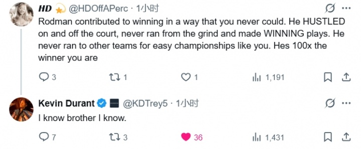 12月01日讯 杜兰特今日又登上了自己的推特大号,跟网友互动。杜兰特跟网友讨论了公牛传奇罗德曼,随后一名网友表示:“罗德曼为球队的胜利做出了你永远无法企及的贡献。他在场上场下都拼尽全力,从不逃避挑战,总能打出制胜一击。他不像你那样为了轻松夺冠而跑路到其他球队。他的成就比你高出百倍。”杜兰特回复说:“我知道,兄弟,我知道的。”