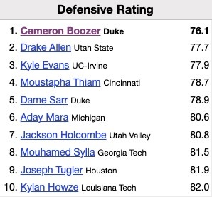小布泽尔每百回合失分只有76.1分,既是队内断档领先,也是全NCAA第一。