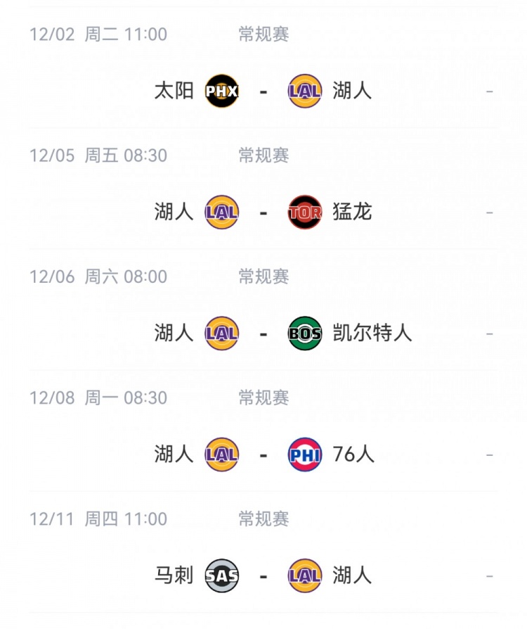 湖人接下来5场比赛赛程如下: