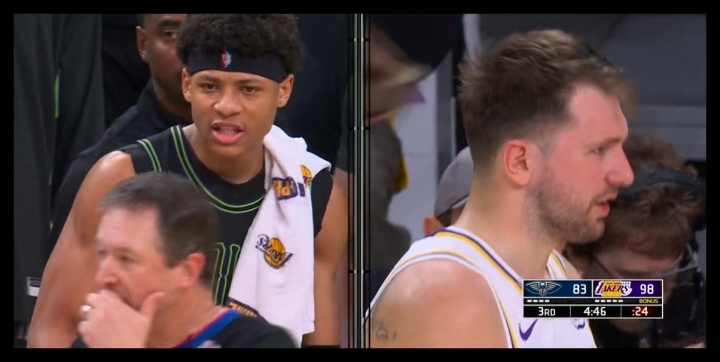 东契奇被鹈鹕新秀费尔斯犯规,很生气,和对手顶牛