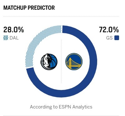 12月25日讯 明日NBA圣诞大战,勇士将在主场迎战独行侠。ESPN对本场胜率进行了预测,其中主场作战的勇士胜率高达72%,独行侠胜率仅28%。目前勇士战绩为15胜15负,排名西部第8,独行侠12胜19负排名西部第11。
