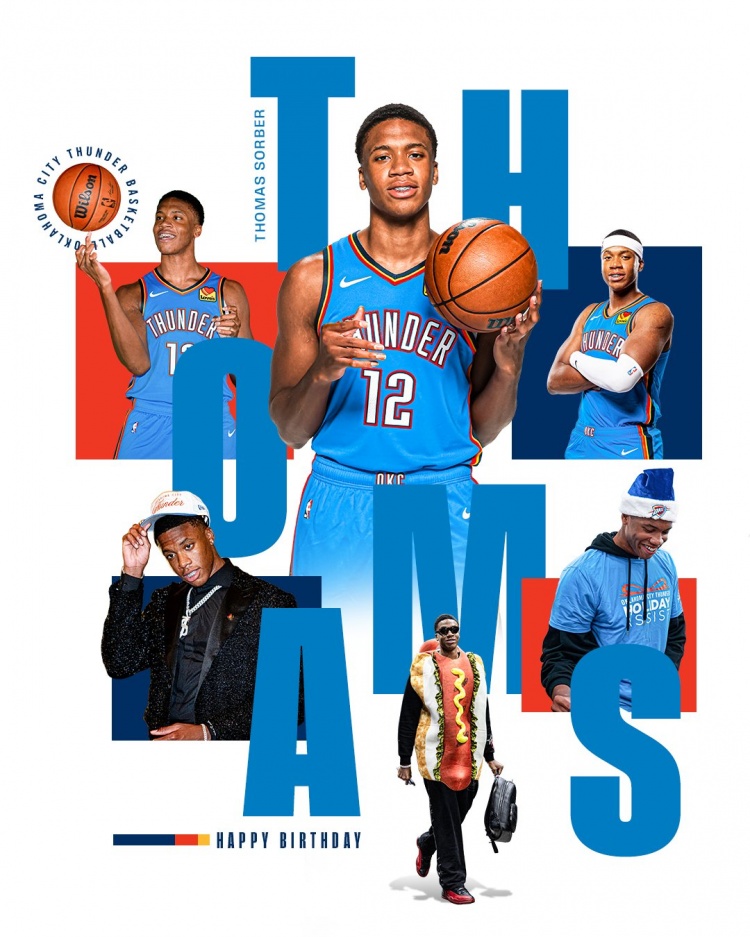 12月25日讯 12月25日是圣诞节、也是雷霆新秀托马斯·索伯的20岁生日。雷霆官方写道:“今天礼物加倍