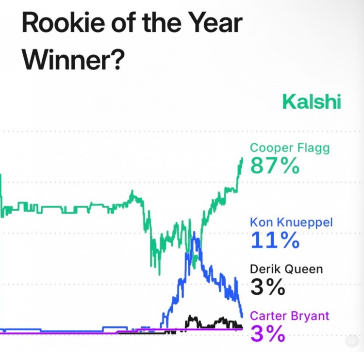 12月28日讯 今天,美国预测市场平台Kalshi Sports更新了本赛季年度最佳新秀的概率,详情如下:1、库珀·弗拉格(独行侠):87.0%2、康·克尼佩尔(黄蜂):11.0%3、德里克·奎因(鹈鹕):3.0%4、卡特·布莱恩特(马刺):3.0%5、VJ·埃奇库姆(76人):2.0%6、亚库乔尼斯(热火):2.0%7、尼克·克利福德(国王):2.0%8、杰斯·理查德森(魔术):2.0%