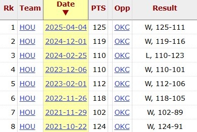 值得一提的是,火箭过去8次主场对阵雷霆取得7胜1负。