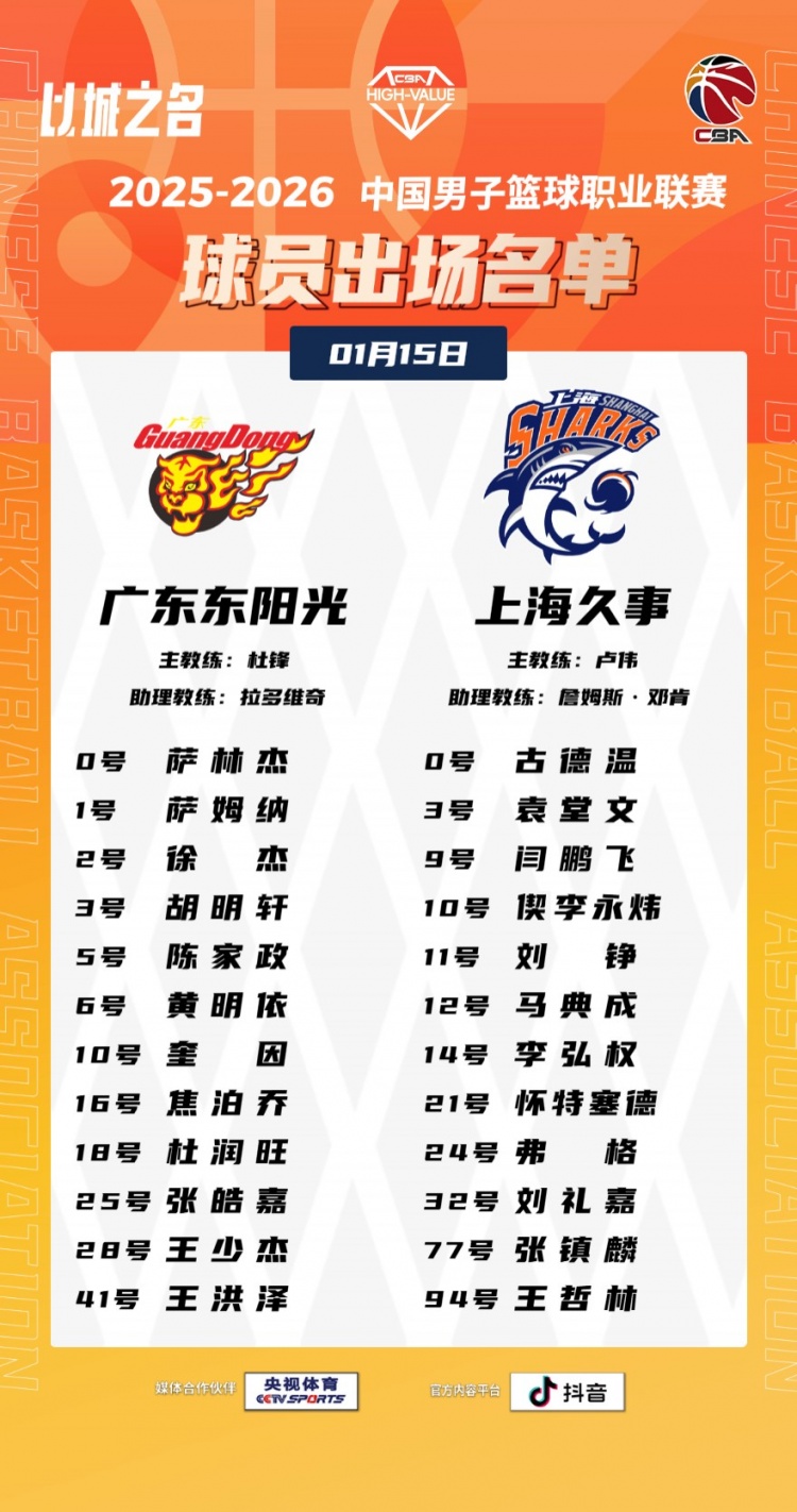 1月15日讯 今晚19:35,广东将在主场迎战上海,赛前大名单出炉。广东:萨林杰、萨姆纳、徐杰、胡明轩、陈家政、黄明依、奎因、焦泊乔、杜润旺、张皓嘉、王少杰、王洪泽。上海:古德温、袁堂文、闫鹏飞、偰李永炜、刘铮、马典成、李弘权、怀特塞德、弗格、刘礼嘉、张镇麟、王哲林。(注:最新更新的大名单,洛夫顿被移除,马典成入替)