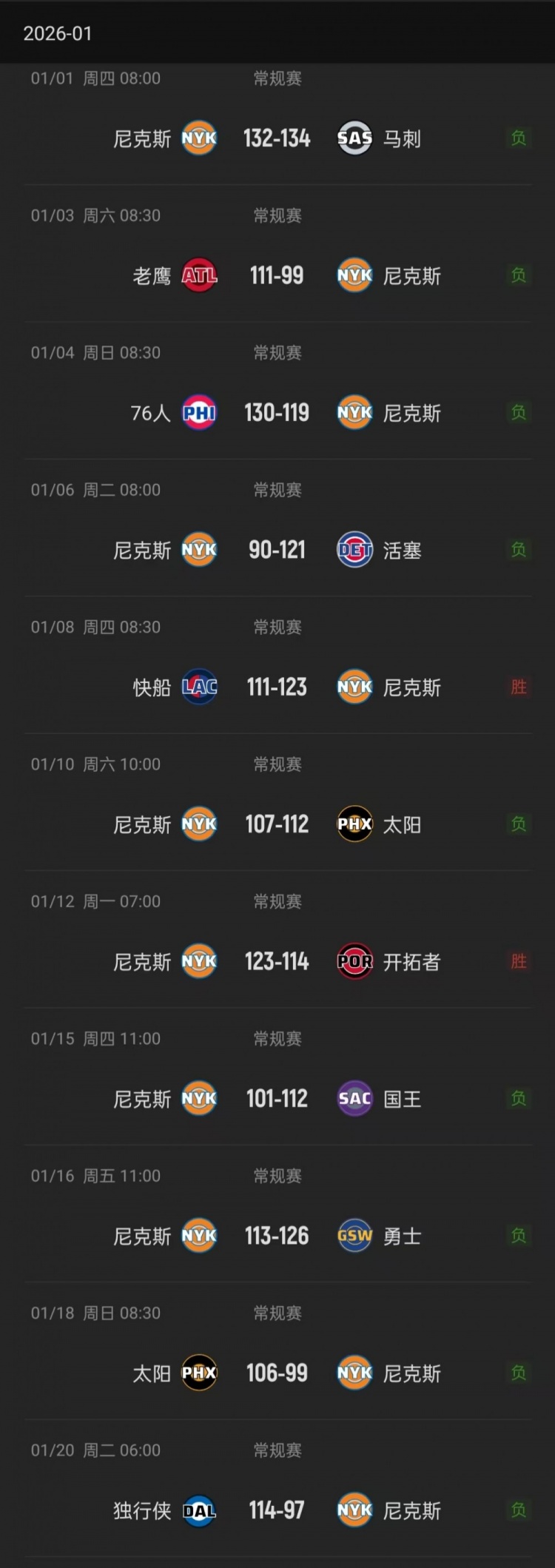算上今天的失利,尼克斯在进入2026年后,11场比赛中输掉了其中9场,仅战胜了快船和开拓者。