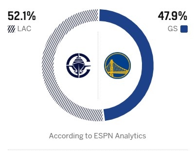 ESPN预测两队本场胜率:勇士47.9%,快船52.1%。