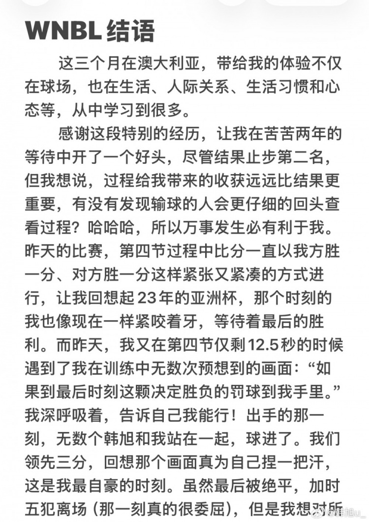 她在微博写道:“希望我的经历能对后面的年轻球员有所帮助,首个中国人参加的wnbl联赛赛季结束啦,它又一次带给我不同的惊喜和体验,我收获了国际友谊,完美的过程,一步一步脚踏实地的成长,希望更多的年轻球员包括教练、裁判、体能训练师、队医、工作人员可以走向国际,来体验不同的篮球世界。也希望我的经历可以为后来的人建立一个路标的存在,终会有人踏着我的脚印来到这里,其实我完全不用把我的感受发出来,只不过给那些有需要的人,关注和爱我的人!在路上⋯”
