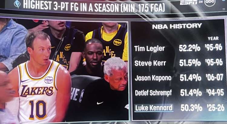 湖人VS尼克斯,转播方晒肯纳德数据,本赛季肯纳德三分命中率已经来到50.3%,能排进NBA单赛季历史前五(至少出手175次及以上):1、蒂姆·莱格勒 52.2% 95-96赛季2、科尔 51.5% 95-96赛季3、杰森·卡波诺 51.4% 06-07赛季4、德特雷夫·施拉姆夫 51.4% 94-95赛季5、肯纳德 50.3% 25-26赛季