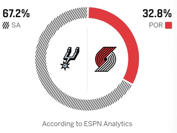 ESPN预测本场比赛胜率,马刺67.2%占据优势,开拓者32.8%。