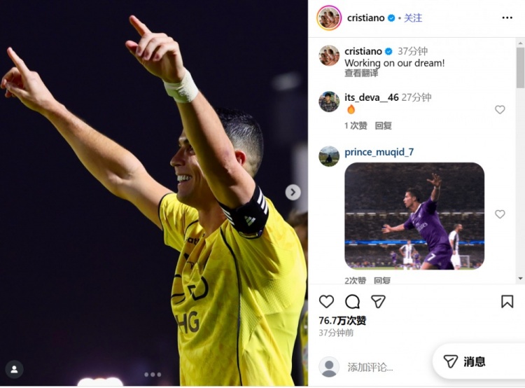在社交媒体上,C罗晒出了自己的庆祝照,并写道:为我们的梦想而努力。