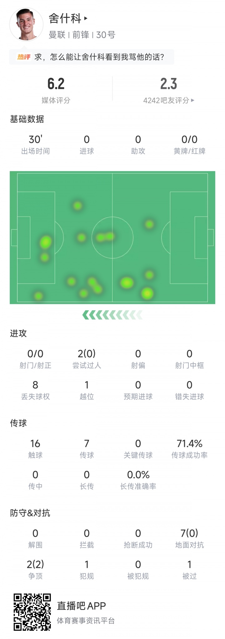 在这半个小时的时间里,舍什科7次地面对抗0成功,16次触球有一半丢了球权。他在第88分钟失单刀时,还因此受伤,致使曼联不得不10人应战。此外,他本场0射门,过人也是0成功。