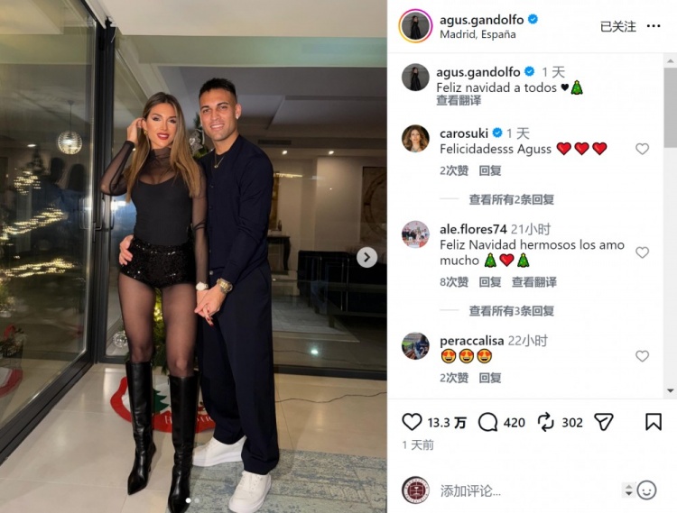 圣诞节之际,奥古斯蒂娜社媒晒出与劳塔罗的合照,定位地点为西班牙马德里,配文:“祝大家圣诞快乐。”