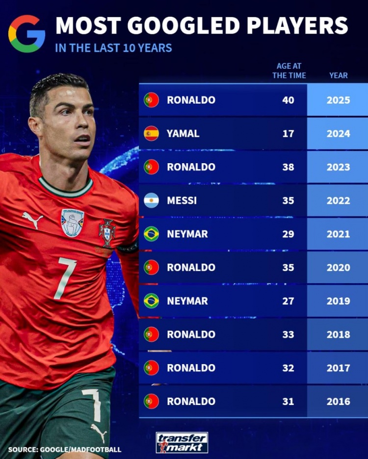 12月27日讯 《转会市场》根据谷歌搜索列出了近10年的年度被搜索次数最多的足球运动员,C罗共计6次登顶。德转列近10年年度被搜索最多球员:2025,C罗2024,亚马尔2023,C罗2022,梅西2021,内马尔2020,C罗2019,内马尔2018,C罗2017,C罗2016,C罗