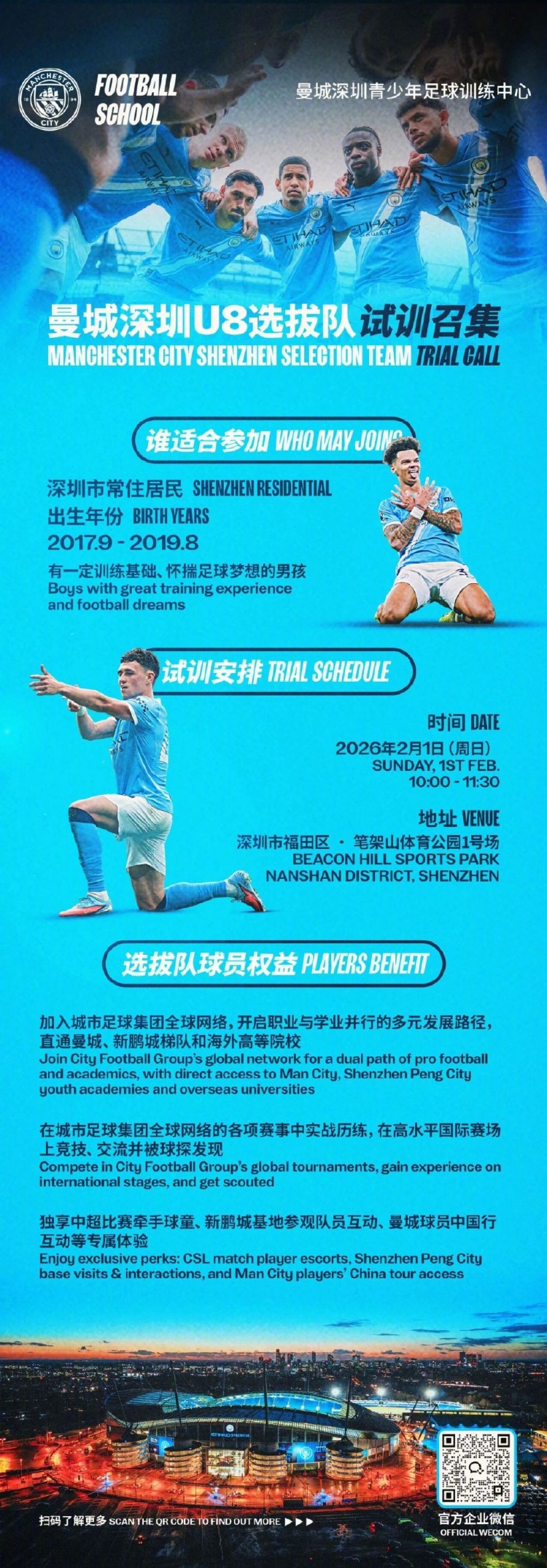 曼城深圳U8选拔队试训召集公告详情如下: