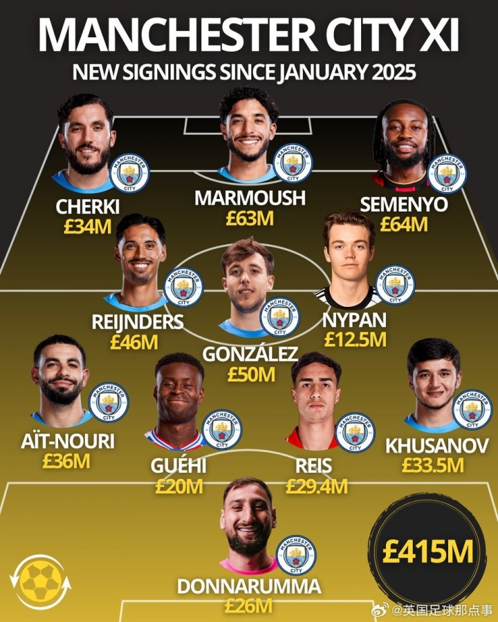 门将多纳鲁马 —— £2600万后卫艾特·努里 —— £3600万格伊 —— £2000万雷斯 —— £2940万胡桑诺夫 —— £3350万中场冈萨雷斯 —— £5000万赖因德斯 —— £4600万尼潘 —— £1250万前场塞梅尼奥 —— £6400万马尔穆什 —— £6300万