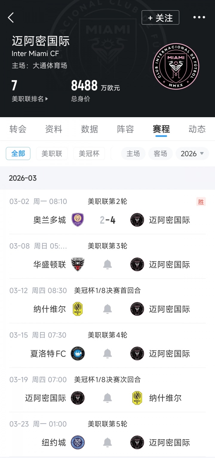 3月份接下来的赛程,迈阿密将对阵华盛顿联、纳什维尔(2场)、夏洛特FC以及纽约城。梅西突破职业生涯900球,很可能在本月实现。