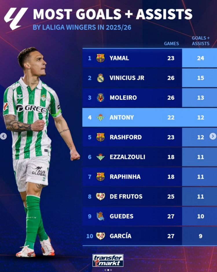 3月12日讯 德转盘点了本赛季西甲边锋位置球员在联赛中参与进球榜,其中亚马尔居首,具体榜单如下(进球+助攻):1、亚马尔(巴萨)23场24球2、维尼修斯(皇马)26场15球3、莫莱罗(比利亚雷亚尔)26场13球4、安东尼(贝蒂斯)22场12球5、拉什福德(巴萨)23场12球6、阿布德(贝蒂斯)18场11球7、拉菲尼亚(巴萨)18场11球8、德弗鲁托斯(巴列卡诺)25场11球9、格德斯(皇家社会)27场10球10、加西亚(巴列卡诺)27场9球