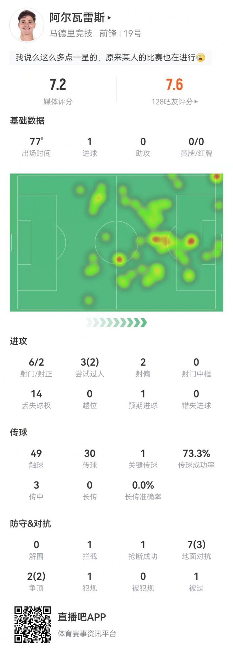 4月30日讯 马竞在本轮欧冠对阵阿森纳,阿尔瓦雷斯本场数据如下:首发出战77分钟1球6射2正3过人、2成功预期进球1.0014丢失球权49触球30传球,73.3%成功率1关键传球3传中1拦截1抢断9对抗、5成功1犯规1被过获评7.2分