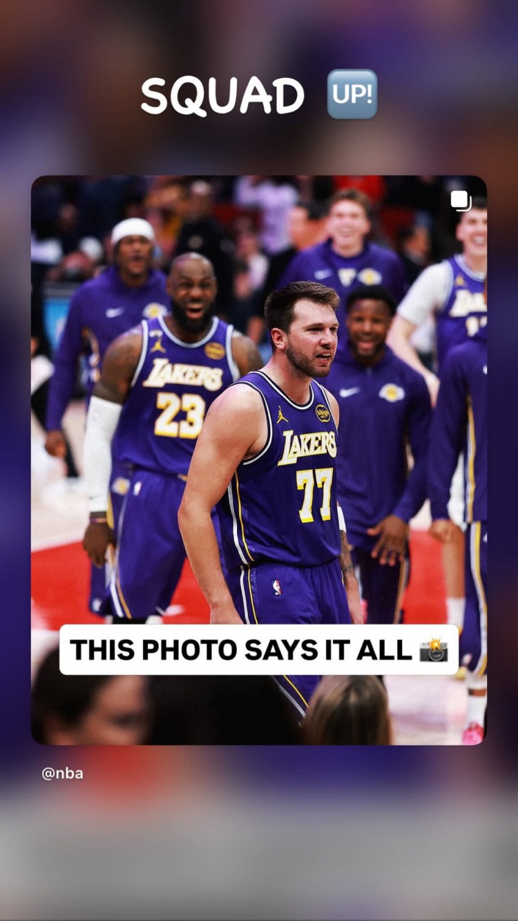 詹姆斯对东契奇投进关键三分后的庆祝照配文道:“士气高涨