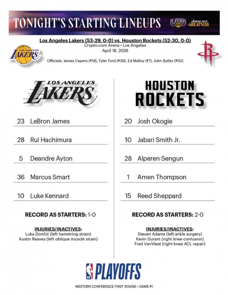 季后赛战火重燃!湖人首发:詹姆斯/八村塁/艾顿/斯玛特/肯纳德