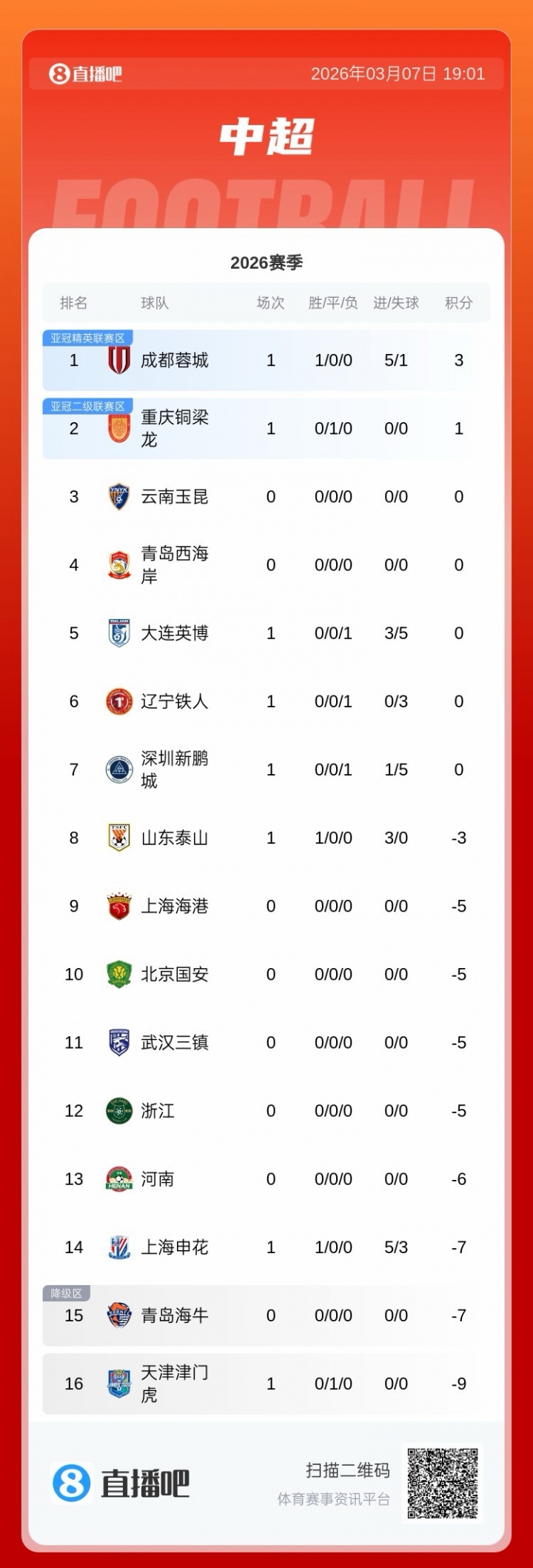 03月07日讯 今日中超首轮,申花5-3战胜大连英博,积分变为负7分,最新中超积分榜如图。稍后19点35分,海港vs河南,玉昆vs海牛。