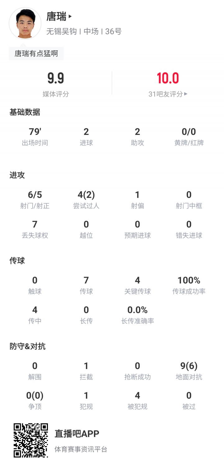 唐瑞挑射破门梅开二度↓