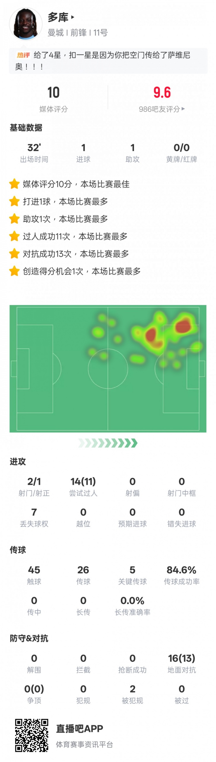 4月26日讯 足总杯半决赛,曼城2-1南安普顿。多库下半场替补登场,在32分钟的上场时间里盘活球队,贡献1球1助攻,11次过人成功,送出5次关键传球,获评10分。多库本场比赛数据:进球1助攻1射门2射正1过人14过人成功11丢失球权7触球45传球26关键传球5传球成功率84.6%地面对抗16地面对抗成功13被犯规2